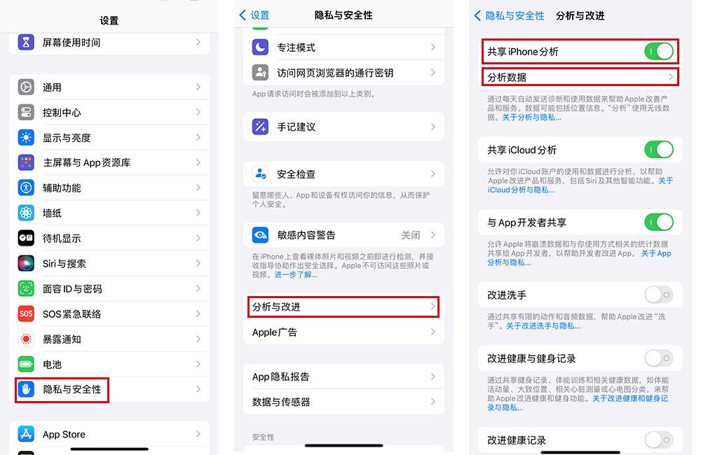 选择「分析与改进功能」,点击「共享iPhone分析」。