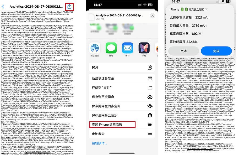 打开最新的日志文件,点击右上角的分享按钮,并选择刚才下载的快捷指令「查询iPhone循环次数」。