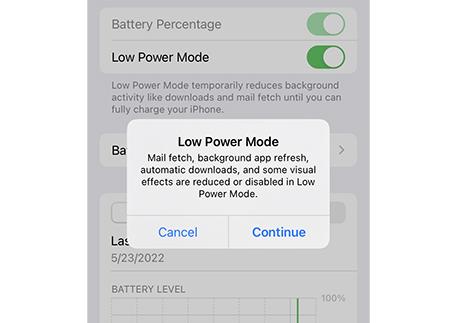 在 iPhone 上,前往“设置”>“电池”并关闭“低电量模式”。