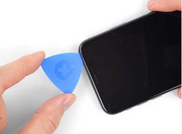 将三角撬片重新插入 iPhone 的底部边缘,然后向右滑动以继续分离粘合剂。