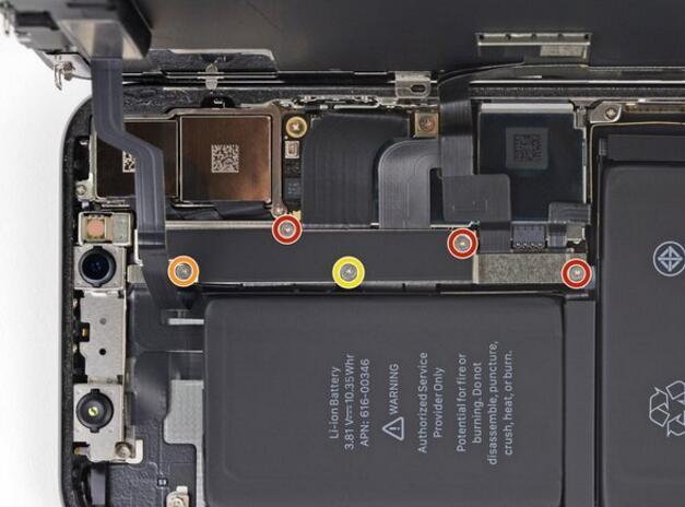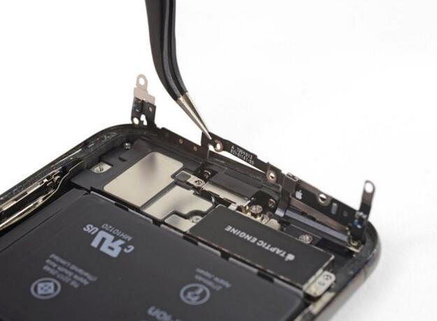 iPhone X 的电池通过四个易拉条连接到手机背面——一个在顶部,三个在底部。每个条带的末端是一个黑色拉片,略微粘在电池边缘。