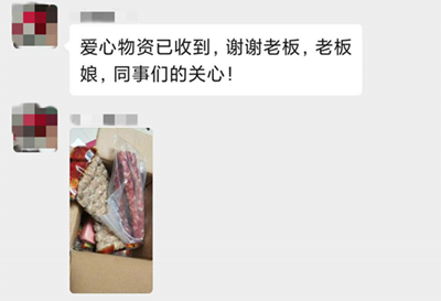 不仅如此,考虑到湖北地区物资缺乏,公司还给依然在湖北的员工寄去了爱心物资。在湖北的同事收到之后非常感动,一致感谢公司的关心。