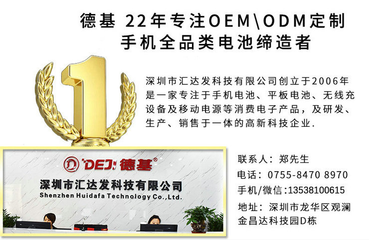 深圳市汇达发科技有限公司创立于2006年,是一家专注于手机电池、平板电池、无线充电设备以及移动电源等消费电子产品,集研发、生产、销售于一体的高新科技企业。